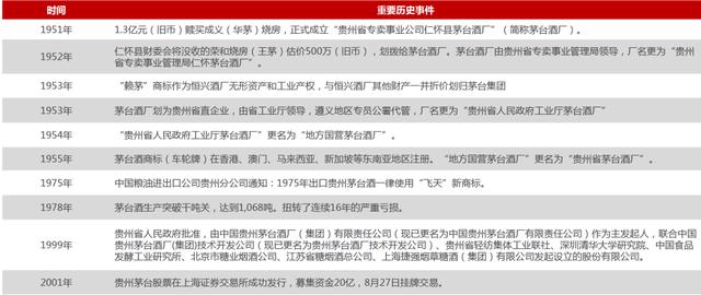 贵州茅台前身“贵州省专卖事业公司仁怀县茅台酒厂”是1951的成义烧房(华茅),1952-1953 年荣和烧房(王茅)、恒兴酒厂(赖茅)分别划拨给茅台酒厂,并于1953 年划为省直企业,厂名变更为“贵州省人民政府工业厅茅台酒厂”。华茅、王茅分别创立于1860 年、1879 年,恒兴酒厂始于1929 年的“衡昌酒房”,生产的酒为“衡昌茅台”, 1941 年,贵阳赖永初接管该酒房并更名为“恒兴酒厂”,“衡昌茅台”也由此更名为“赖茅”。于1999年改制重组形成贵州茅台股份有限公司,2001年上市。