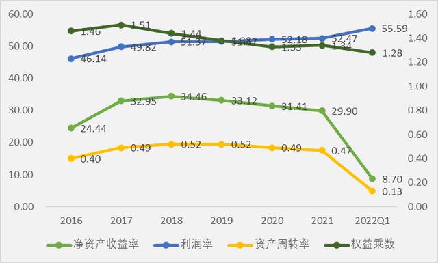 近年来由于公司强大的盈利能力,公司资产负债率呈下降趋势,预计未来负债水平依旧呈下降趋势,权益乘除有可能呈下降之势。