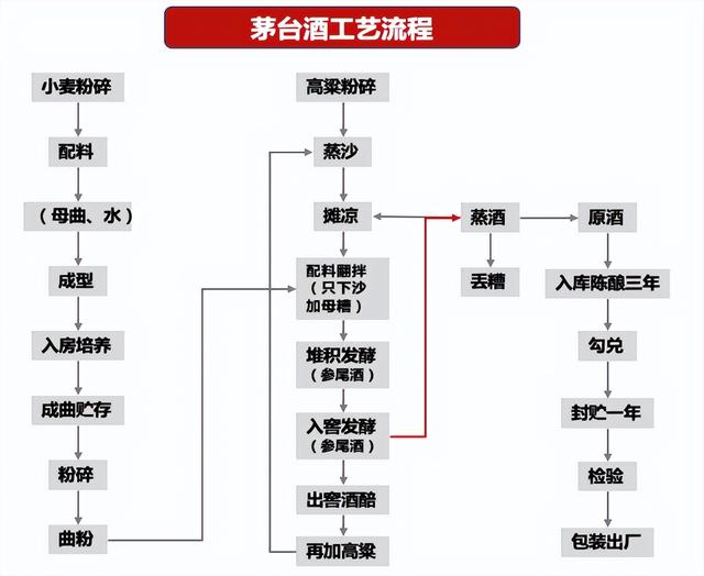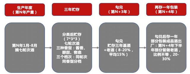 独特酿酒工艺与产品品质塑造茅台核心竞争力。酱香酒不同于其他香型白酒,其生产周期较长、出酒率较低,主要生产环节包括:制曲、制酒、贮存、勾兑和包装五个流程。一般端午前后开始制曲,重阳下沙,再经过发酵、取酒形成基酒,再勾兑、存储形成半成品,最后经过存储勾兑、检验包装形成品酒,整个过程历时至少五年时间。总结起来其工艺特点包括:三高(高温制曲、高温堆积发酵、高温接酒)、三低(入池水分低、曲子糖化率低,原料出酒率低)、三多(轮次多、用曲多、粮耗多)、一少(辅料少)。经过多年的生产和技术改进,形成了其独特的酿造风格和工艺特点,具有不可复制性。此外酱香酒生产过程中严格的原料、苛刻的产区、复杂的工艺、长周期的储存和老酒勾兑方法,使得产品具有较好的协调度和柔和度;酱香酒在接酒时温度在 40 度以上,高温下易挥发物质自然挥发较多,且经过三年存储,易挥发物质存留较少,对人体刺激也相对较少;再者,酱香酒中留存有较多对人体有益的乳酸和乙酸,更受到人们的认可。因此茅台自身独特的酿酒工艺与产品品质是塑造起核心竞争力的因素之一。