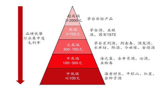 白酒价格带较宽:我国白酒行业经过多年的充分竞争发展,目前已经形成了较为鲜明的竞争格局。根据零售价格将白酒分为 2000 元/瓶以上、700-2000 元/瓶、300-700 元/瓶、100-300 元/瓶和 100 元/瓶以下的白酒分别分为超高端酒、高端酒、次高端酒、中高端酒和低端酒。其中,超高端主要品牌是茅台非标产品;高端酒的主要品牌有飞天茅台、五粮液和国窖 1573 等,次高端主要有茅台系列酒、剑南春、酒鬼酒、郎酒等品牌,中高端主要有海之蓝、古井贡酒、汾酒,中低端酒主要有老村长、牛栏山等。