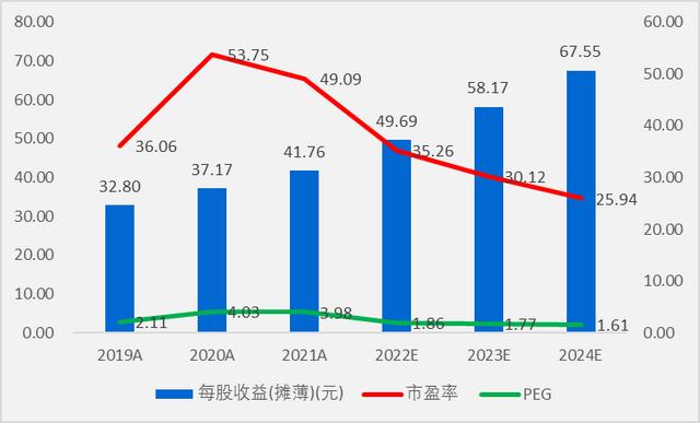 根据机构一致性预测,贵州茅台2024年业绩增速在16.13%左右,EPS为67.55元,19-24年5年复合增长率15.54%。目前股价1752.00元,对应2024年估值是PE 25.94倍左右,PEG 1.61左右。