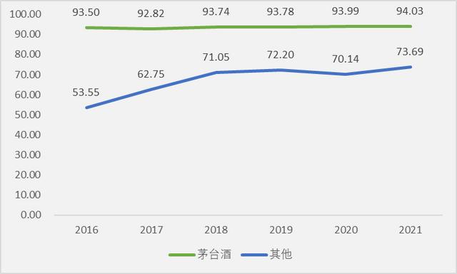 茅台资产周转率呈稳中有降趋势,由于茅台产品的特殊性,预期公司资产周转率维持稳定。