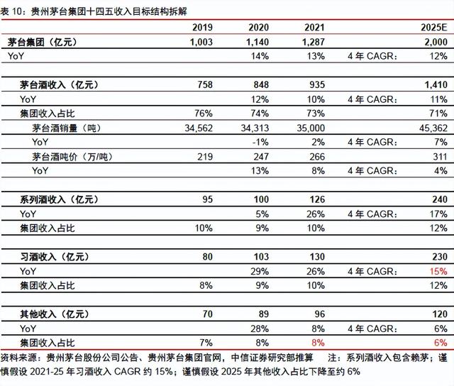 根据《仁怀市国民经济和社会发展第十四个五年规划和二〇三五年远景目标纲要》,2025 年茅台集团营业收入达到2,000 亿元。其中,茅台集团董事长丁雄军在2021 年酱香系列酒全国经销商联谊会上明确提出,“酱香系列酒‘十四五’末要努力实现营收翻番,达到240 亿元以上,占集团比重在10%以上”。假设2025 年习酒收入约230 亿元(对应4 年CAGR 约15%),其他收入约120 亿元(集团收入占比约6%),则推算茅台酒收入目标为1,410 亿元左右,对应4 年CAGR 约11%。