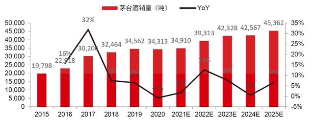 价方面,预计2021-25 年茅台酒吨价CAGR 达4%左右即可完成集团收入目标。以集团2025 年收入目标对应测算茅台酒2025 年收入目标约为1,410 亿元,而现有产能及工艺限制下2025 年理论可供销量最大约为4.5 万吨,故推算2025 年茅台吨价至少应达311万/吨,对应2021-25 年吨价CAGR 仅约4%左右,价格策略方面压力不大。