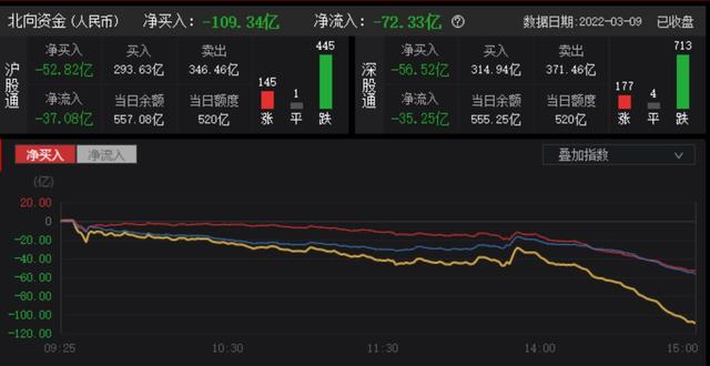 北向资金流出金额突破百亿元,全天净卖出109.34亿元,其中,沪股通净卖出52.82亿元,深股通净卖出56.52亿元。