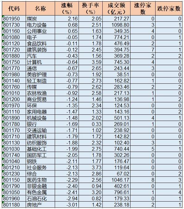 行业板块方面,仅3个申万一级行业上涨,其余行业均下跌。煤炭、电力设备、公用事业分别上涨2.16%、0.68%、0.65%;房地产、石油石化、有色金属、非银金融、医药生物等5个行业跌幅均超2.2%。