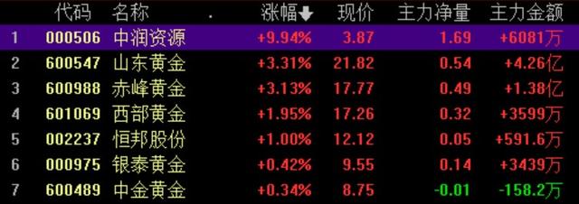 随着近期黄金价格的攀升,黄金股也备受投资者热捧,贵金属板块全天涨幅居前,中润资源涨停,山东黄金赤峰黄金涨幅均超3%。