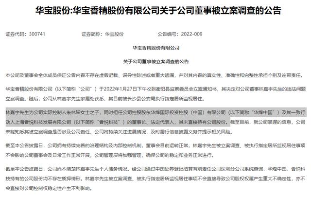 华宝国际(00336.HK)1月27日深夜也发布公告称,林嘉宇因涉嫌违法接受立案调查。