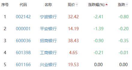 宁波银行、平安银行、招商银行、工商银行、兴业银行位列涨幅榜后五位,涨幅分别为-2.41%、-1.39%、-0.90%、-0.21%、0.00%。