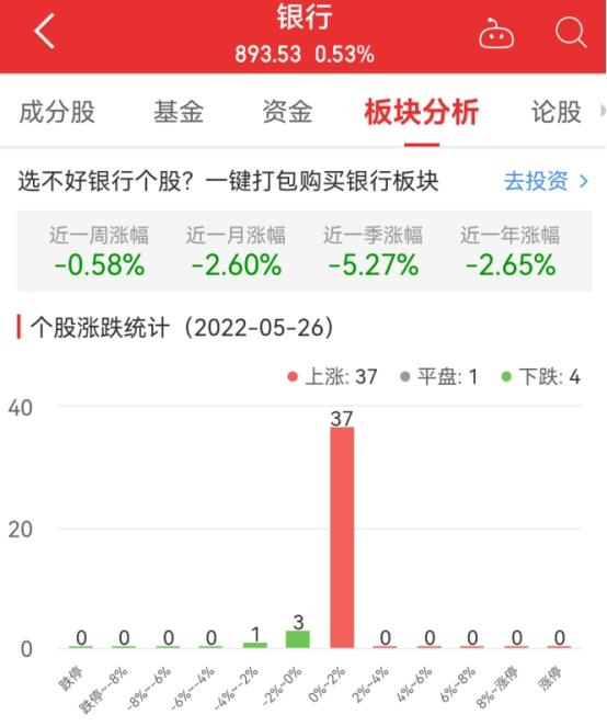 中国经济网北京5月26日讯 今日,银行板块整体涨幅0.53%,其中37只股票上涨,1只股票平盘,4只股票下跌。