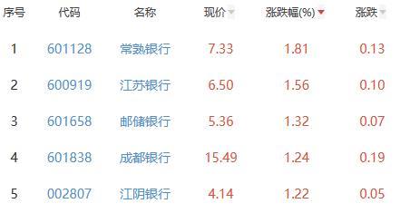 其中,常熟银行、江苏银行、邮储银行、成都银行、江阴银行位列板块涨幅前五位,涨幅分别为1.81%、1.56%、1.32%、1.24%、1.22%。