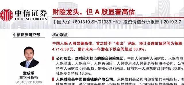 这份研报的作者是中信证券研究部的非银行业分析师团队,从研报的作者署名顺序来看,主要执笔人是非银联席首席分析师童成墩。值得注意的是,这位分析师曾经在2019年3月7日高点精准看空过中国人保,现在成为了非银行业的首席分析师。