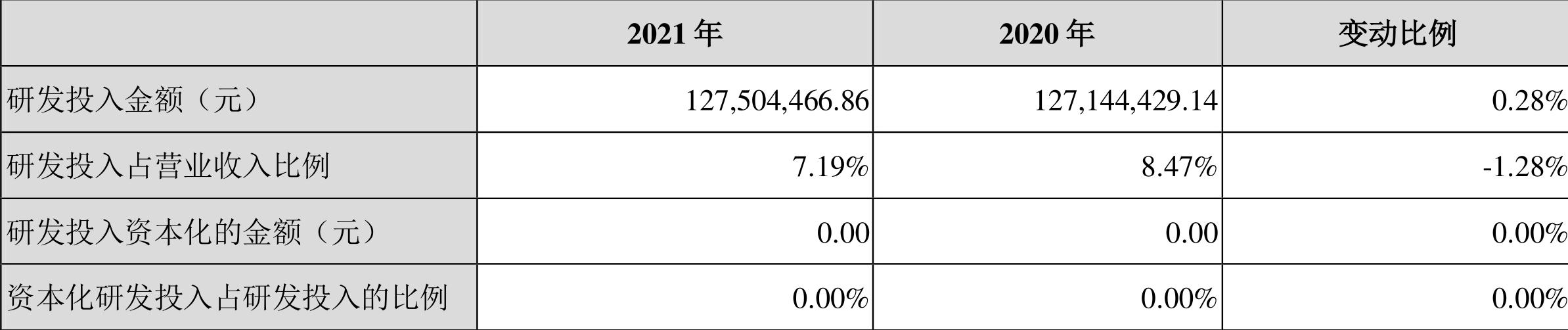 2021年全年,公司研发投入金额为1.28亿元,同比增长0.28%;研发投入占营业收入比例为7.19%,相比上年同期下降1.28个百分点。此外,公司全年研发投入资本化率为0。