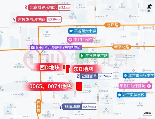 地块位于六环外平谷住城区,分为两部分。其中B地块(0065、0074地块)在平谷三中西侧,D地块位于新开西街南侧,销售指导价均为3.2万/㎡。周边新房如京投发展璟悦府、北京城建樂知筑均价也在3.2万/㎡;周边在售二手房源较少,公园壹号目前均价约3.2万/㎡,南侧的都丽华府均价约2.8万/㎡。