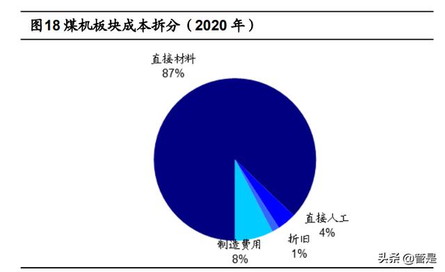 煤机行业对于钢材的需求量大,直接成本占比高,盈利能力受钢材价格影响较大。 2016-2020 年,公司煤机板块直接材料成本占比均高于 80%,2020 年达到 87%。对于 钢材成本控制,公司具有规模优势。公司产量规模位居行业第一,带动钢材及备件采购、 能源消耗、人工成本等综合成本较之其他竞争对手始终处于有利地位。为进一步扩大材 料采购价格优势,公司从事钢材贸易业务,依托自身采购平台及资金的优势,对钢材等 物资进行集中采购,用于生产及对外批发零售赚取利润。根据公司关于对上交所对公司 2019 年年度报告的信息披露监管问询函的回复公告,煤机板块每年的钢材采购量约为 80 万吨左右,其中用于贸易的约为 40%,大批量采购有效降低采购成本,与主营业务 形成协同效应。2020 年公司贸易收入 21.8 亿元,占营业收入比例 8%,毛利率为 4%。