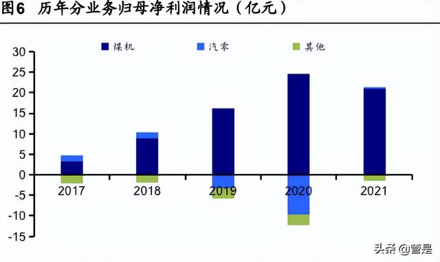 分业务盈利看,煤机业务盈利占绝对主导地位,特别是 2019~2020 年,汽零业务发 生亏损。2021 年,公司煤机/汽零业务归母净利分别为 20.9/0.1 亿元,同比-15.3%/扭亏 为盈,其中煤机板块盈利同比下滑主要受原材料价格大幅上涨、行业竞争加剧等因素影 响,而汽零板块受益于全球汽车市场的恢复,实现盈利扭亏为盈。