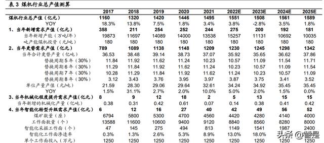 综上,我们得到 2022-2025 年煤机行业总产值为 1551/1508/1561/1589 亿元,增速 为 3.8%/-2.8%/3.5%/1.8%,煤机行业产值有望高位上行。