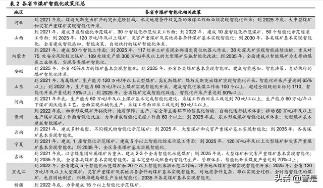 我们认为,随着煤矿去产能的持续推进,目前我国已基本实现在产矿井机械化全覆盖, 未来的重点发展方向应是煤矿智能化转型。 2020 年 2 月 25 日,国家发展改革委、能源局、应急部、煤监局、工信部、财政部、 科技部、教育部 8 部委联合印发《关于加快煤矿智能化发展的指导意见》,加快推动煤 矿智能化发展并提出 3 个阶段性目标。2021 年 6 月 5 日,国家能源局、国家矿山安全 监察局研究印发《煤矿智能化建设指南(2021 年版)》,进一步落实煤矿智能化建设要求。
