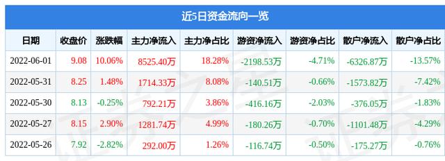 资金流向数据方面,6月1日主力资金净流入8525.4万元,游资资金净流出2198.53万元,散户资金净流出6326.87万元。