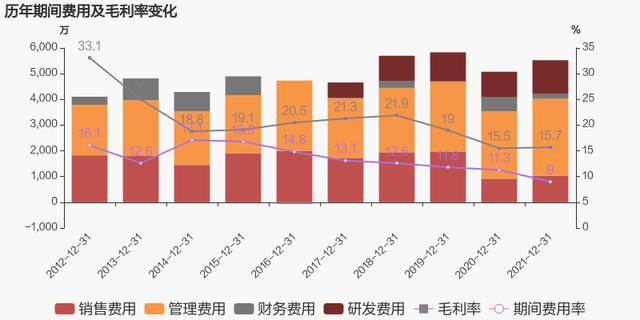 公司2021年营业成本5.2亿,同比增长36.1%,低于营业收入36.4%的增速,导致毛利率上升0.2%。期间费用率为9%,较去年下降2.3%。