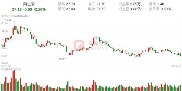 同仁堂今日下跌2.16%,股价为27.12元,成交金额为1.88亿元,成交6万手,换手率为0.50%。