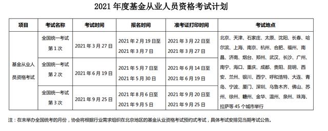 1月7日,中国证券投资基金业协会发布关于2021年度基金从业考试计划的通知,2021年度基金从业人员资格考试拟在全国45个城市举办3次,考试时间分别是3月27日、6月19日和9月25日。在未举办全国统考的月份,协会将根据行业需求组织在北京地区的基金从业资格考试预约式考试。