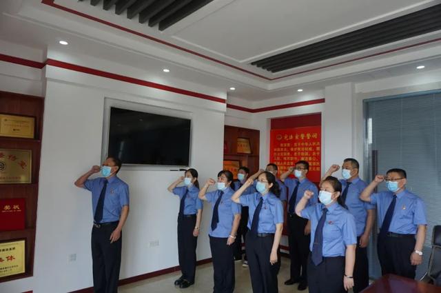 在党组成员、副检察长曲辉的带领下,全体党员干警隆重举行重温入党誓词仪式,继承革命传统,牢记光荣使命,坚守责任担当,争做合格党员。全体党员面对着鲜红的党旗,高举右手,用铮铮誓言向党作出了郑重的承诺,表达不忘初心、牢记使命的坚定信念和决心。