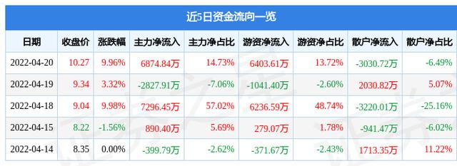 资金流向数据方面,上个交易日主力资金净流入6874.84万元,游资资金净流入6403.61万元,散户资金净流出3030.72万元。近5日资金流向一览见下表: