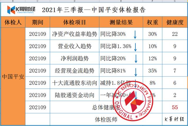 上市公司好比我们每个人的身体,经营是否健康,每期最新发布的财务报表就是为股东准备的一个窗口,方便持有人实时跟踪了解中国平安的经营属于哪个阶段。通过上面的ROE净资产收益率、营业收入和净利润、经营现金流净额、十大流通股东持股变动、陆股通北上资金减持动向,K哥按照自己的投资理念出具了一份基于中国平安2021年三季报数据的体检报告,详见下图。