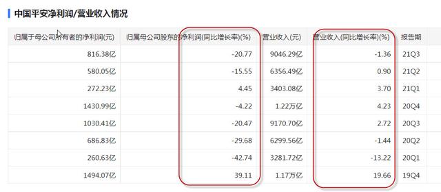 第二个体检项目看平安的营业收入和净利润,2021年平安的营收停滞不前,二季报和三季报净利润分别下滑15%和20%。