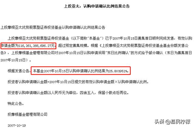 一日售罄,认购金额高达1162.61亿,由于基金限额300亿,最终认购申请确认比例仅为25.8%。这些数字放在当下,可能也不是特别惊人,但是你想想这是2007年的事情,想想那个时候的房价、工资水平?