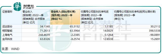 目前国内风电主机厂商还有运达股份、明阳智能、上海电气等。对比今年一季度的业绩,运达股份、明阳智能分别以约65%、约63%的营收增速领先金风科技。营收规模较大的上海电气今年一季度营收增速也小幅下滑2个百分点。