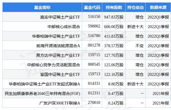 其中持有数量最多的基金为嘉实中证稀土产业ETF,目前规模为25.17亿元,最新净值1.1342(5月18日),较上一交易日上涨0.59%,近一年上涨18.68%。该基金现任基金经理为田光远。