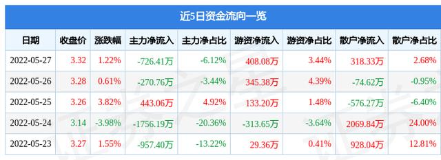 资金流向数据方面,5月27日主力资金净流出726.41万元,游资资金净流入408.08万元,散户资金净流入318.33万元。