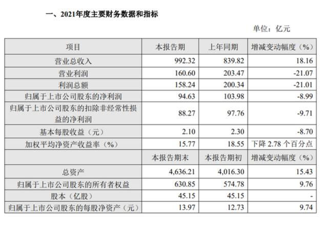 2月15日,金地集团发布2021年度业绩快报,期内,公司实现营业收入992.32亿元,同比增加18.16%。盈利方面,金地集团实现利润总额158.24亿元,同比下降21.01%;归属上市公司股东的净利润为94.63亿元,同比下降8.99%。