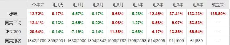 成立以来累计收益率高达135.8%,近3年来涨幅超同期沪深300近23%。虽然今年业绩普普,但近期表现还算抗跌。