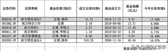 史博现任基金资产规模为78.76亿元,旗下运作基金4只。其中,独自管理的基金仅南方瑞合(501062)一只,规模为13.7亿元,其余三只与其他基金经理合管。
