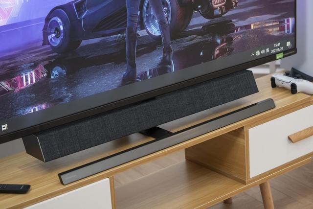 飞利浦猛腾559M1RYV自带的Soundbar就出自Bowers&Wilkins,表面由Kvadrat制作的高级扬声器面料覆盖,内部由2个10W中高音扬声器和1个20W低音扬声器组成,总功率达到了40W,音量很足,还提供了6种声音模式,优化声音体验。