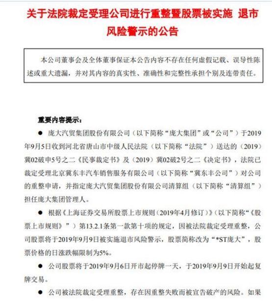 本文摘要:85亿市值的庞大集团被1700万借款给“压垮了”!9月5日晚,A股上市公司庞大集团间发布公告称,因被法院裁定受理重整,公司股票将于2019年9月9日被实施退市风险警示,股票简称改为“*ST庞大”,股票价格的日跌幅限制为5%。公告显示,庞大集… …