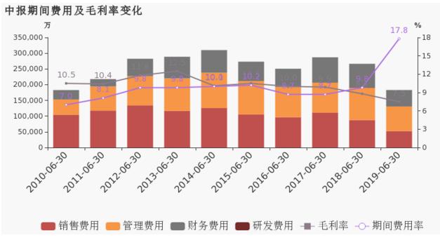 具体看,虽然公司2019半年度营业成本94.9亿,同比下降61.6%,但你低于营业收入62.2%的下降速度,毛利率下降1.4%。期间费用率为17.8%,较上年升高8%,对公司业绩形成拖累。经营性现金流近两期均为负,本期为-21.1亿,上期为-67.6亿。