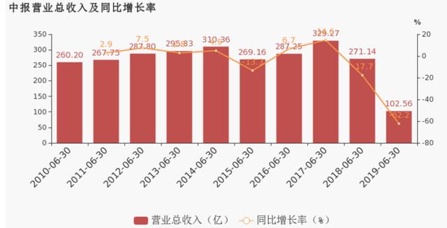 庞大集团于2019年8月31日披露中报显示,公司2019上半年实现营业总收入102.6亿,同比下降62.2%,降幅较去年扩大。