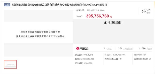 2021年7月26~27日,四川省成都市新都区人民法院在淘宝网司法拍卖网络平台,对四川西部资源控股股份有限公司(ST西源 600139)持有的重庆市交通设备融资租赁有限公司(重庆交通租赁)57.5%的股权进行第二次公开拍卖,评估价7.067085亿元,起拍价为3.9575676亿元,最终重庆城市交通开发投资(集团)有限公司(重庆开投集团)一次出价以起拍价拍下,成交价相当于评估价的5.6折。