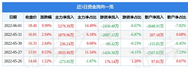 资金流向数据方面,6月1日主力资金净流入5279.39万元,游资资金净流出2430.48万元,散户资金净流出2848.91万元。