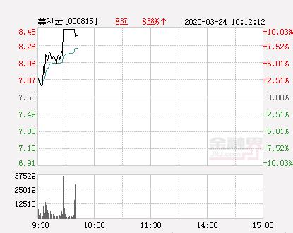 金融界网站3月24日讯 今日美利云开盘报7.89元,截止10:00分,该股涨10.03%报8.45元,封上涨停板。