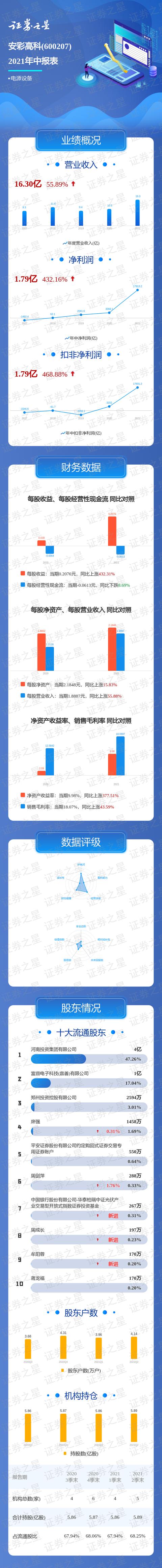 本文摘要:证券之星数据中心讯,安彩高科2021中报显示,公司主营收入16.3亿元,同比上升55.89%;归母净利润1.79亿元,同比上升432.16%;扣非净利润1.79亿元,同比上升468.88%;负债率29.86%,投资收益106.52万元,财务… …
