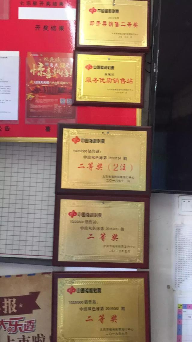 最令人印象深刻的是店里面挂着的几个奖牌,那是从开业到现在店里出过的几个奖项,是荣誉的象征。包括2017年度西城区服务优质销售站,双色球第2015028期、第2018134期、第2019082期二等奖和2015年度即开票销售二等奖,另外,还有一些不计其数的小奖。