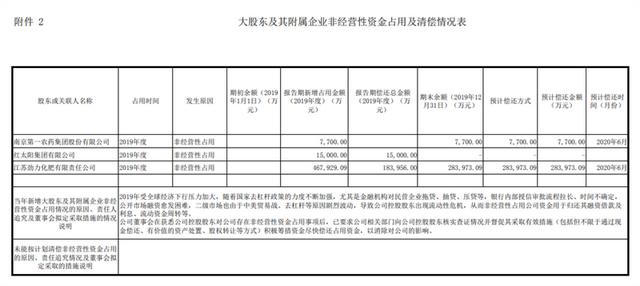29.5亿元遭控股股东及其关联方违规占用,是如何发生的?记者查阅公告发现,最大规模非经营性资金占用发生在2019年,当年除了红太阳集团有限公司占用1.5亿元当年归还外,大股东南一农占用了7700万,江苏劲力化肥有限责任公司占用了46.792909亿元,扣除当年归还的18.3956亿元,仍然违规占用了28.397309亿元,两者合计29.17亿元。