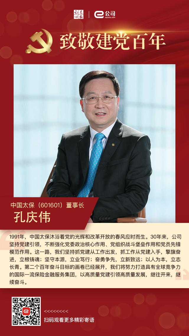 致敬!中国太保(601601)董事长孔庆伟寄语建党百年