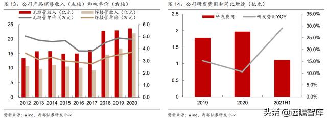 公司2020年无缝管均价4.78万元/吨,焊接管单价3.71万元/吨,处在上升通道,这与公司每年递增的研发投入密不可分,2021年H1公司研发投入1.11亿元,同比增长29.06%,相当于2020全年研发投入的56.3%。