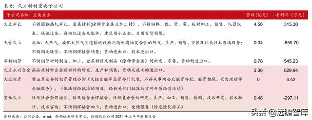 久立特材直接控股合金公司55%的股份,2021年上半年,合金公司营业收入2.36亿元,净利润830万元,对久立特材2021年上半年营收和净利的直接贡献分别为1.29亿元和456万元。未来随着合金公司规划项目逐步投产,其对久立特材营收和净利的贡献将得到提升。